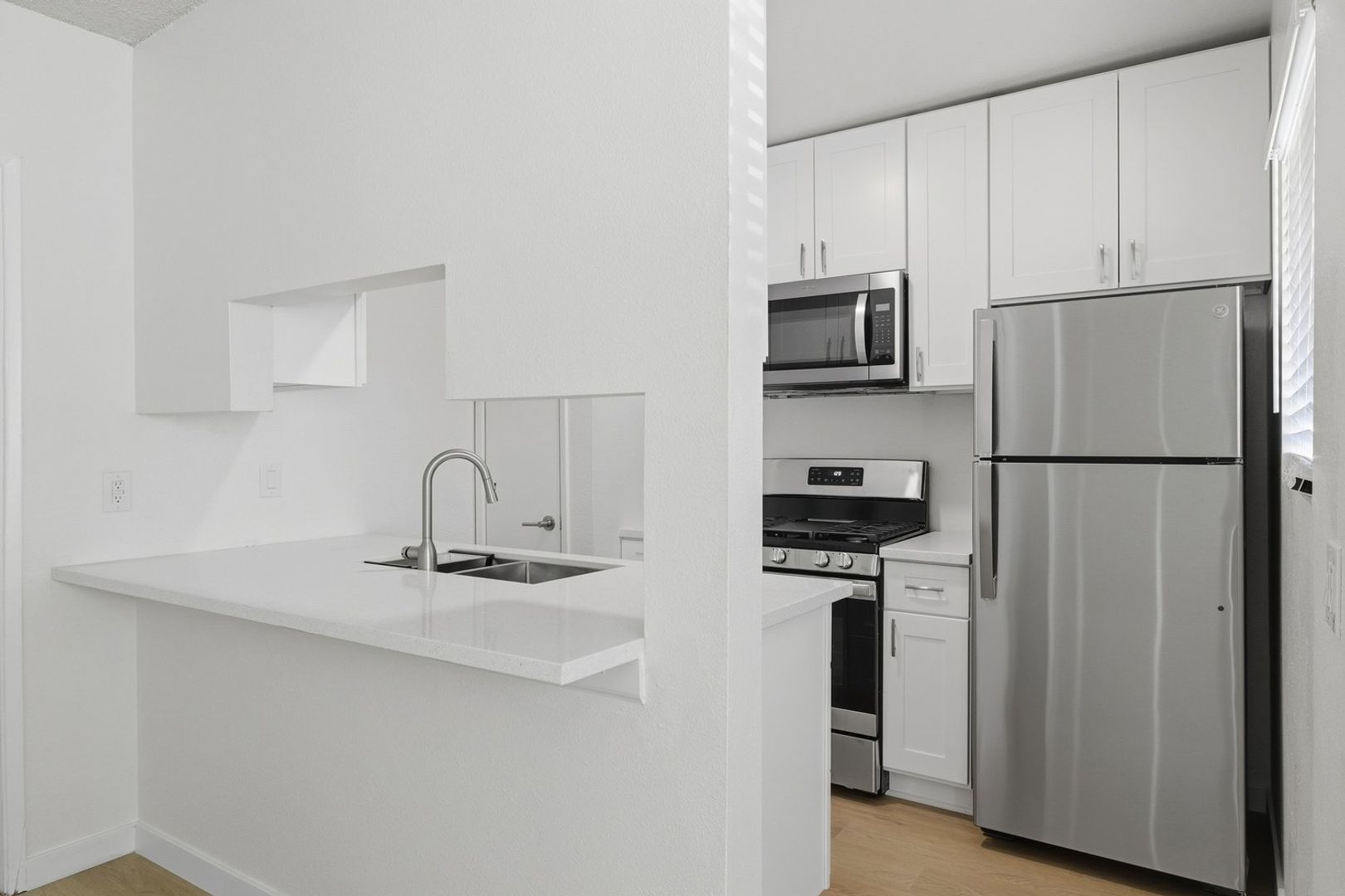 • Sleek stainless-steel kitchen featuring a premium GE refrigerator and gas range, plus a Whirlpool microwave mounted above the range